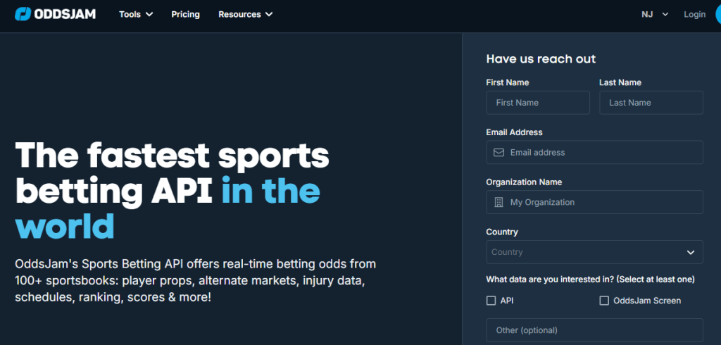 - Additional Information: OddsJam provides a comprehensive suite of tools designed for sports bettors, including real-time odds comparison across multiple sportsbooks, arbitrage and middle betting opportunities, and positive expected value (EV) betting strategies. Their platform covers a wide range of sports and leagues, offering detailed insights to help users make informed betting decisions. For API access and integration details, it’s recommended to contact OddsJam directly through their website.