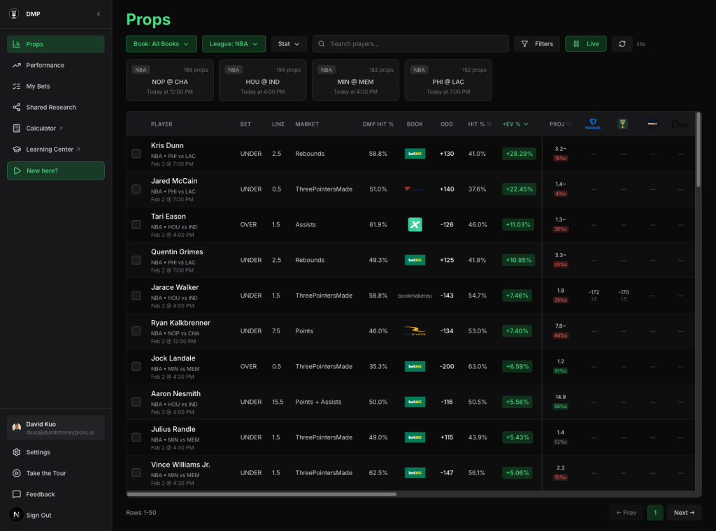 By combining real-time prop pricing with fundamental analysis, DMP helps users make more rational player prop decisions.