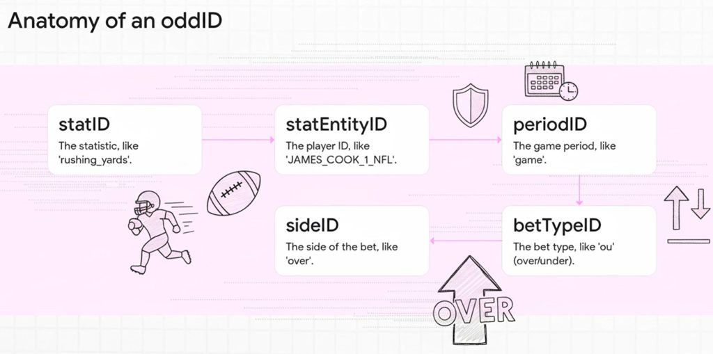 https://api.sportsgameodds.com/v2/events?apiKey=API_KEY_HERE&oddsAvailable=true&leagueID=NFL&oddIDs=rushing_yards-JAMES_COOK_1_NFL-game-ou-over,rushing_yards-JAMES_COOK_1_NFL-game-ou-under So let’s break down what an odd ID really is. I know it looks a little complex, but it’s just five simple parts, all stitched together.