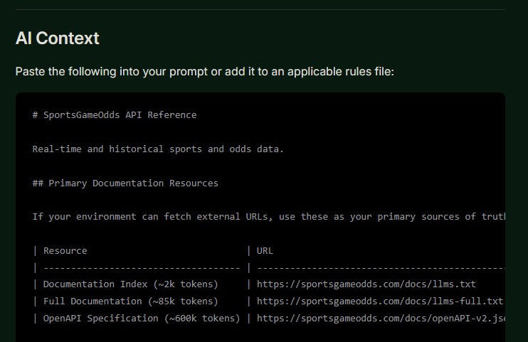 That’s where the SportsGameOdds API stands out. We’ve built a dedicated AI-friendly documentation and MCP setup that allows AI assistants to generate accurate, production-ready code for real sports betting apps, models and odds data use cases.